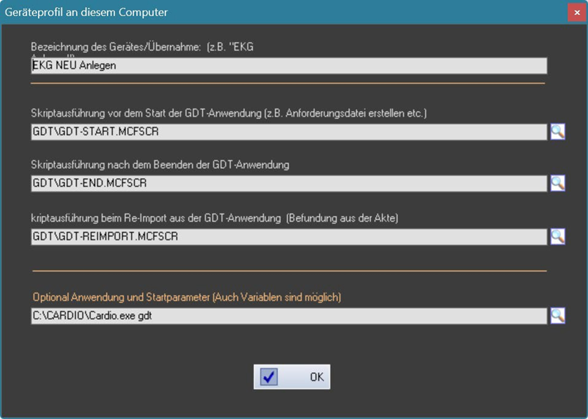 Vollständiges Beispiel zur Anbindung an das EKG der Firma Cardiosoft unter Verwendung des Datenaustausches im Ordner C:\CARDIO. Das Beispiel zeigt die Konfiguration für Cardiosoft (wichtig: der Startparameter hinter dem Programmaufruf „gdt“).