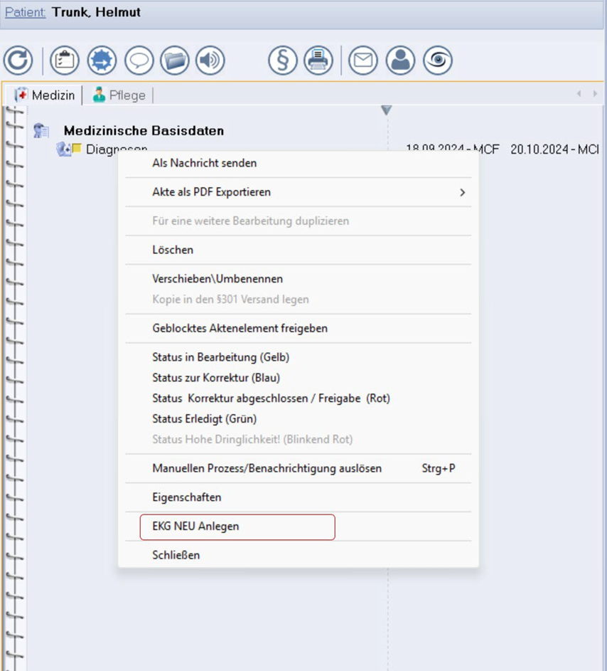 Wenn Sie in der Akte sind, erscheint nach dem Öffnen des jeweiligen Patienten bei einem Rechtsklick auf irgendein Aktenelement das Pop-up Menü, wo auch EKG NEU Anlegen zu finden ist.
