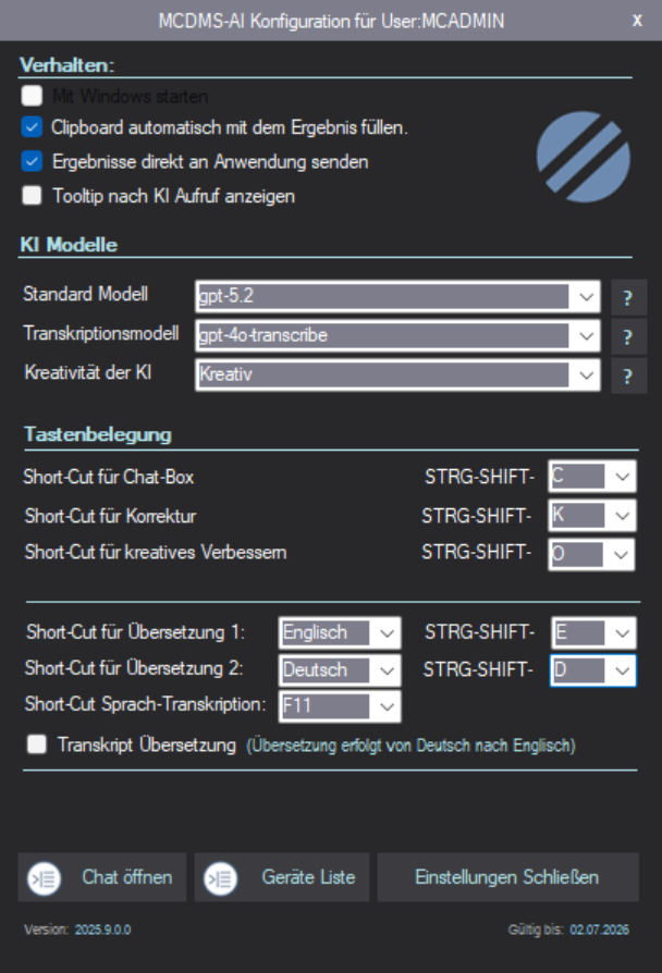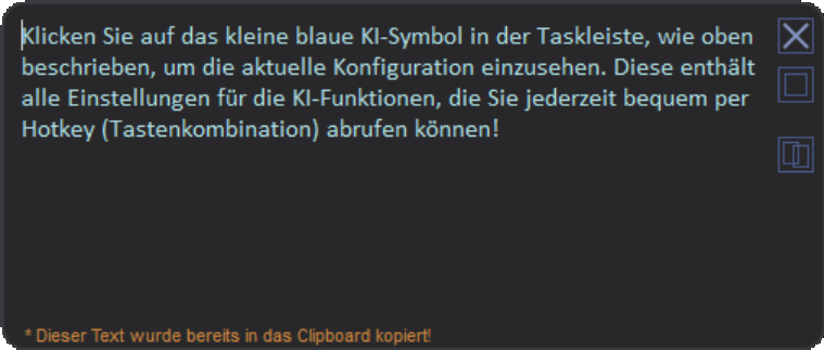 Klicken Sie auf das kleine blaue KI-Symbol in der Task-leiste wie oben beschrieben um die aktuelle Konfiguration einzusehen. Diese enthält alle Einstellungen für die KI-Funktionen, die Sie jederzeit bequem per Hotkey (Tastenkombination) abrufen können!