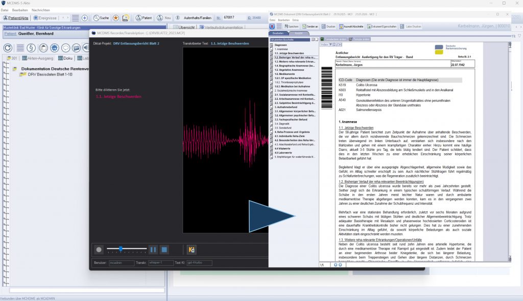 Klicken Sie auf „Diktat abschließen“, wird das Diktat in Text umgewandelt, die Audiodaten entfernt, der Text in die Datenbank geladen und das verbundene Dokument erstellt.