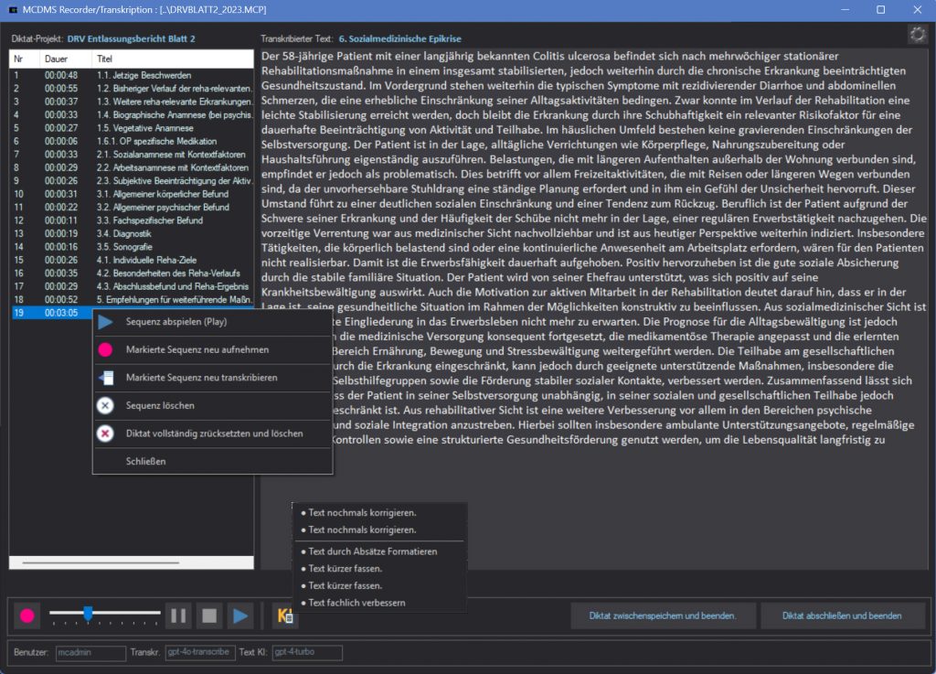Klicken Sie auf ein bereits erstelles Diktat für einen Abschnitt so können Sie dort für sich sprechende Funktionen auswählen.