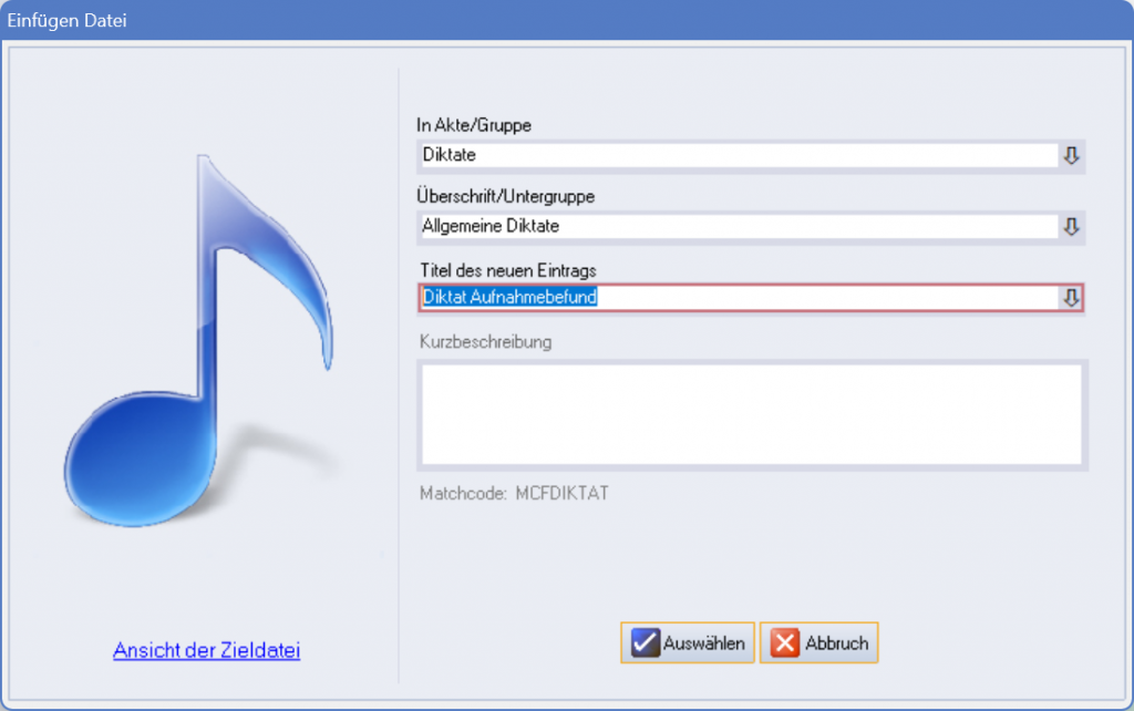 Nachdem Sie das Diktat abgeschlossen haben, ordnen Sie es bitte der entsprechenden Diktat-Gruppe zu. Sollte dies nicht funktionieren, weil es von uns oder Ihrer IT-Abteilung nicht eingerichtet wurde, wenden Sie sich bitte an uns.