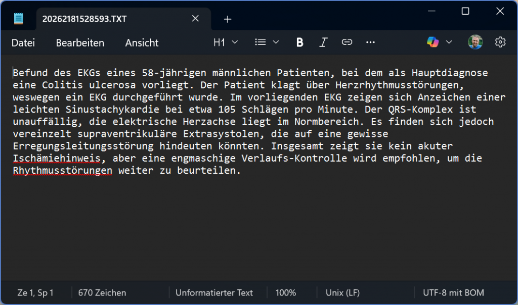 Selbstverständlich können Sie, wie bereits erwähnt, im gesamten System manuell diktieren. Zusätzlich haben wir einen speziellen Modus entwickelt, der nach entsprechender Einrichtung durch uns oder Ihre IT-Abteilung ermöglicht, vollständige Befunde oder Berichte direkt zu diktieren und diese anschließend automatisch erstellen zu lassen.