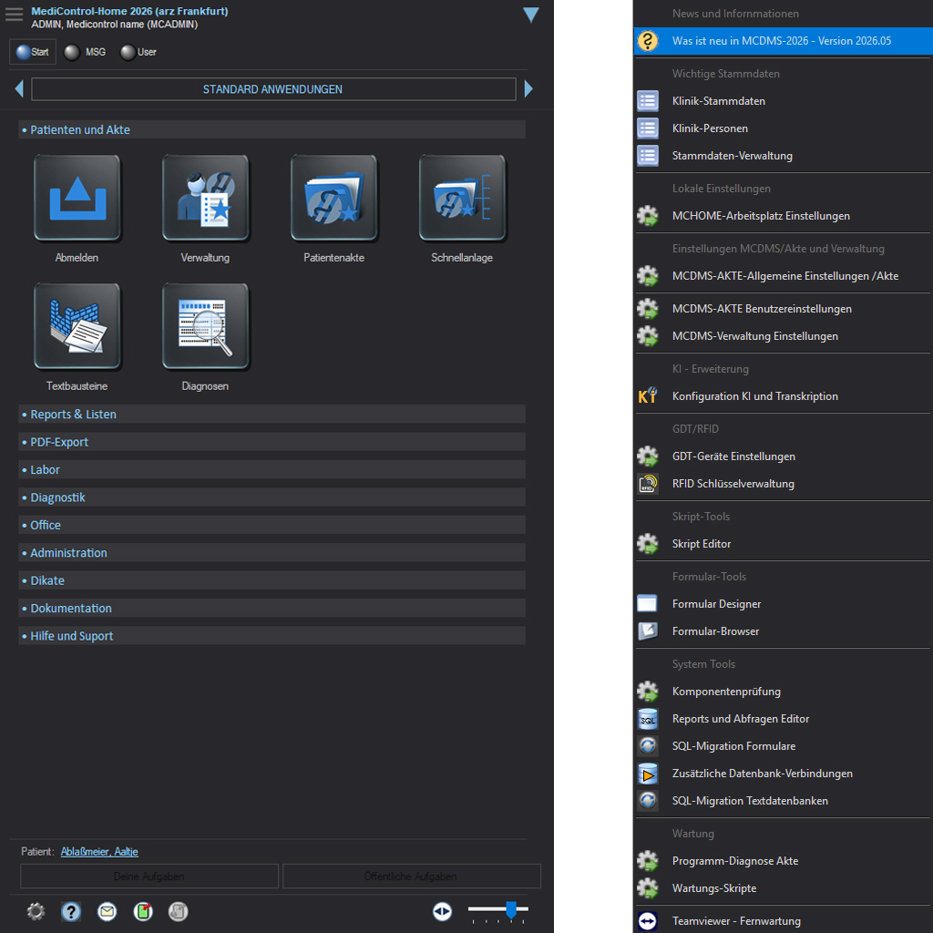 Die Oberfläche stellt eine strukturierte Navigation bereit, über die Anwender schnell auf Patienteninformationen, medizinische Dokumentationen, administrative Funktionen und Systemwerkzeuge zugreifen können.